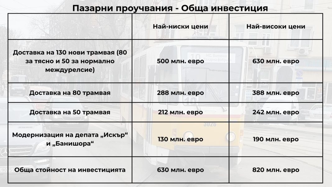 Припомняме, че пазарните проучвания бяха обявени директно от Столична община в средата на февруари. Те бяха две – първото за доставката на 80 трамвая за междурелсие 1009 мм и модернизация на депо „Банишора“, а второто – за доставка на 50 трамвая за междурелсие 1435 мм и модернизация за депо „Искър“. Залагаше се на 30-годишна пълна поддръжка.