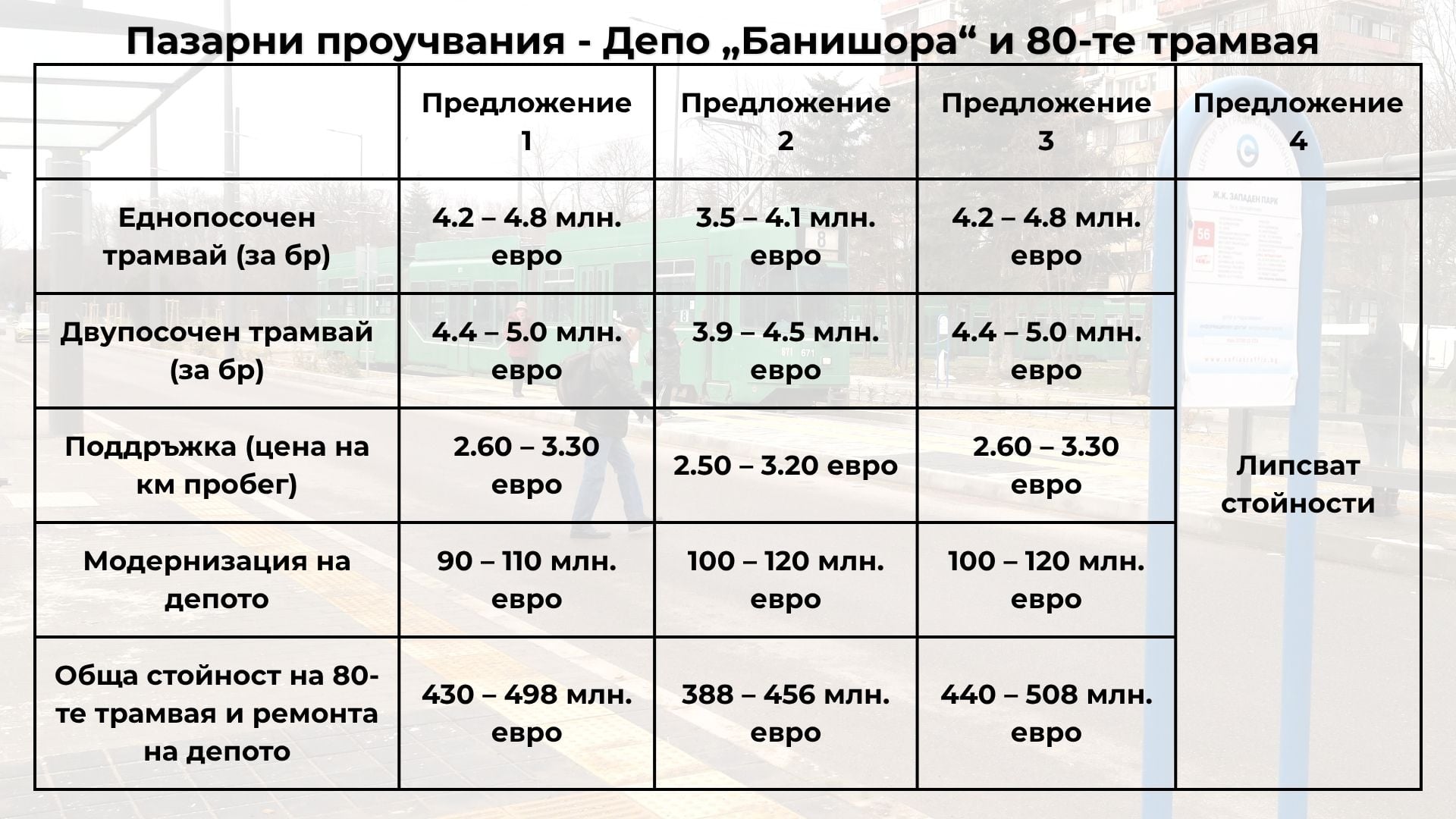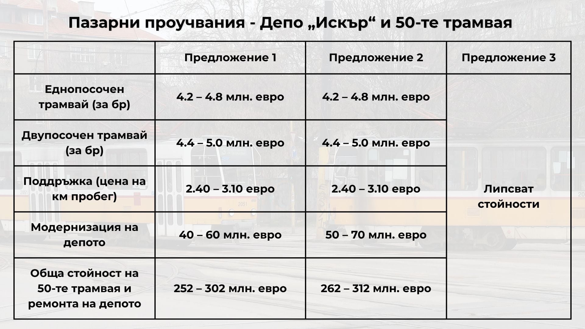 За еднопосочните трамваи стойностите варират между 4.2 и 4.8 млн. евро без ДДС за брой, а за двупосочните – между 4.4 и 5 млн. евро без ДДС за брой.
