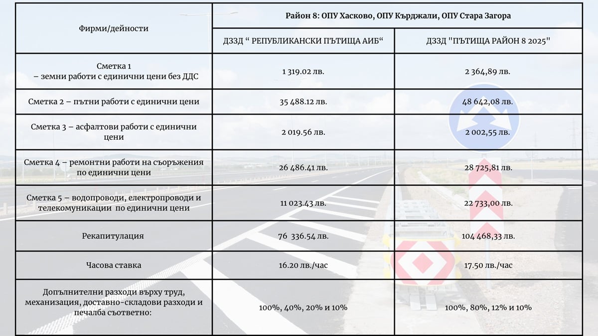 • Часова ставка за труд: Тук виждаме най-високите нива – 16.20 лв./час за „АИБ“ и цели 17.50 лв./час за „Пътища Район 8 2025“. За сравнение, в Район 2 и Район 5 ставката е твърдо 15 лв./час.