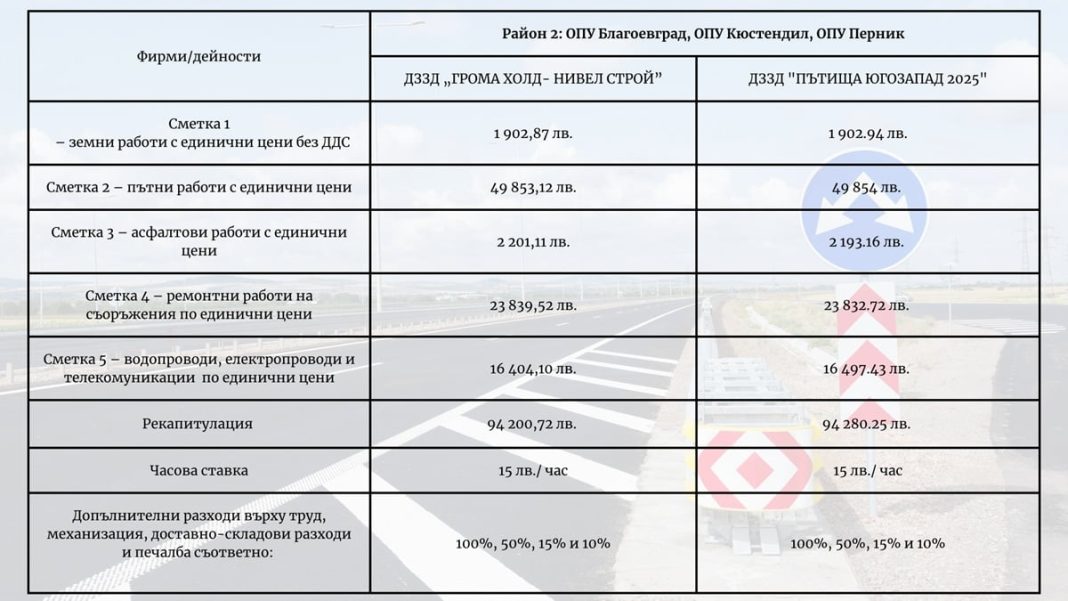 • Земни работи: ДЗЗД „Републикански пътища АИБ“ предлага 1 319.02 лв., докато ДЗЗД „Пътища Район 8 2025“ залага почти двойно повече – 2 364.89 лв.