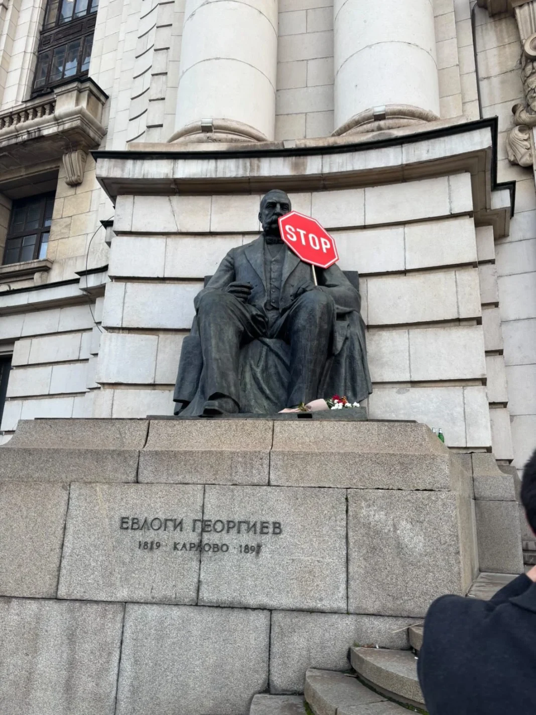 Сутринта на 2 декември поставихме знаци „STOP“ в ръцете на статуите на Евлоги и Христо Георгиеви, спуснахме ярък червен банер от фасадата и превърнахме коридорите на университета в „червена зона“, облепена с десетки постери STOP.