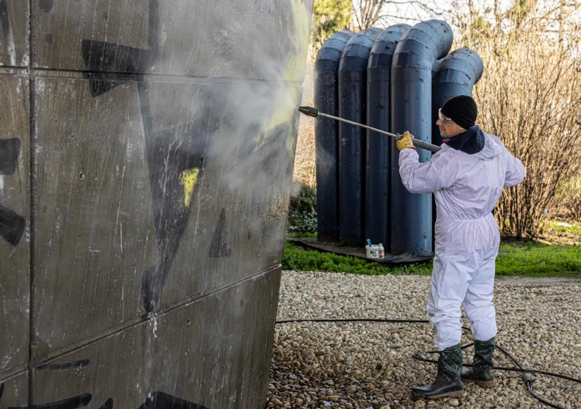 Премахването на надписите се извършва със специализирана техника, съобразена с различните видове повърхности, като към момента се използва водоструйна техника с високо налягане.