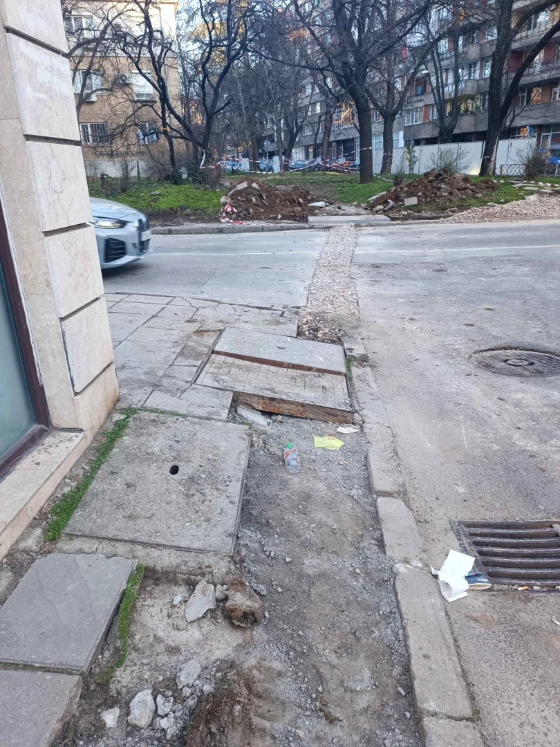 Това е тротоарът на ул. „Софийски герой“, която стига до бул. „Цар Борис III“. По план този участък ще бъде в ремонт до средата на месец май; снимка: Actualno.com