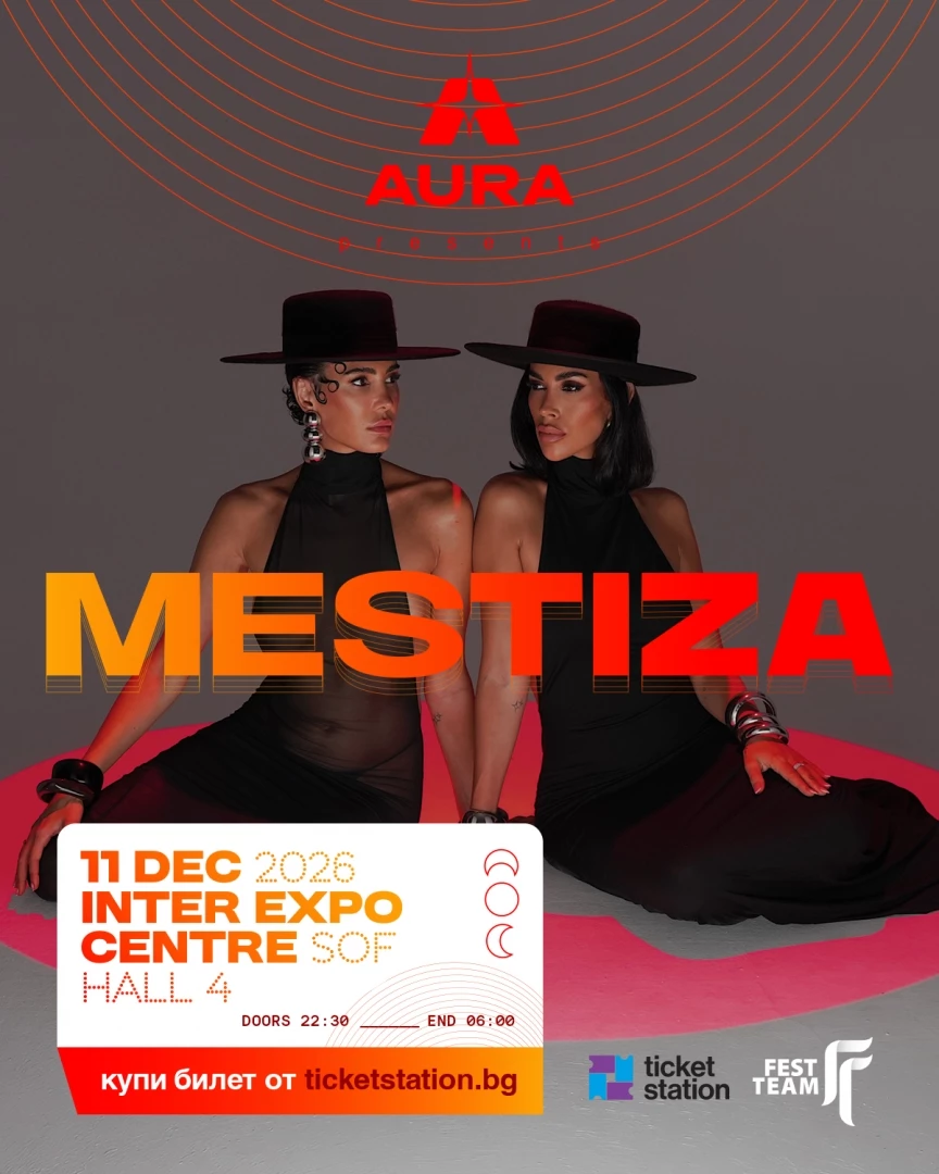 AURA представя MESTIZA – енигматичното испанско дуо ще сгорещи страстите в София с екзотичен електронен лайв на 11-и декември в Inter Expo Centre. В събитието ще вземат участие още DJ Diass и Dimo BG, които ще допълнят енергичния заряд на вечерта с автентичен стил и селекция. Билетите за събитието са в продажба в мрежата на Ticket Station на цени от 66 евро.