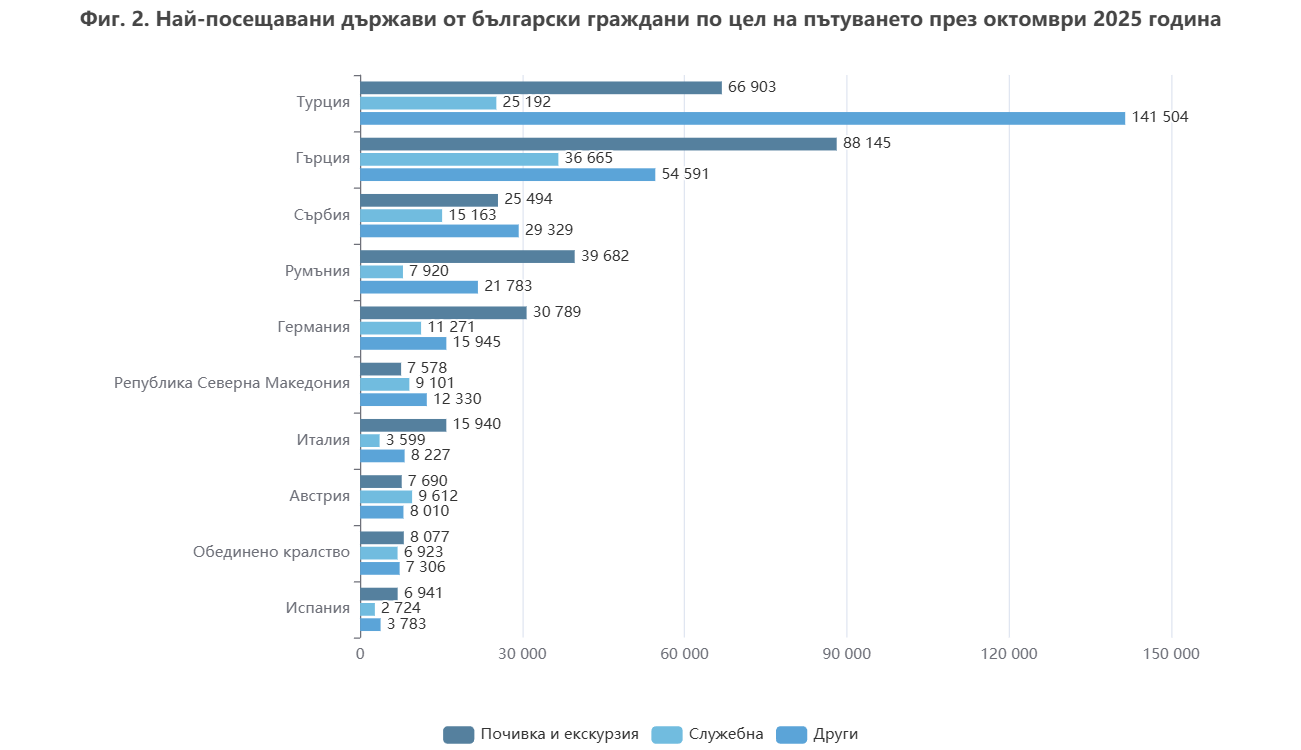 Най-голям брой пътувания на български граждани са осъществени към: Турция – 233.6 хил., Гърция – 179.4 хил., Сърбия – 70 хил., Румъния – 69.4 хил., Германия – 58 хил., Република Северна Македония – 29 хил., Италия – 27.8 хил., Австрия – 25.3 хил., Обединено Кралство – 22.3 хил., Испания – 13.4 хиляди.
