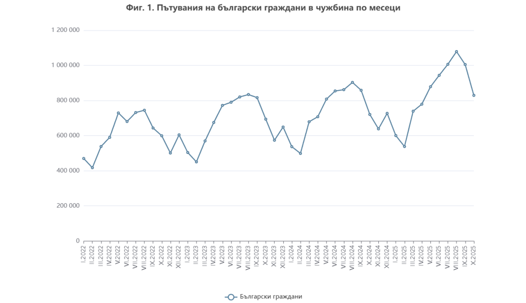 Българите, пътуващи в чужбина по всякакъв повод, продължават да се увеличават през есента. Данните на Националния статистически институт (НСИ) показват, че само през октомври общият брой на пътуванията на български граждани до друга държава, е нараснал до рекордните 829.3 хил., или с 15% спрямо същия месец на 2024 г. Регистрирано е увеличение на пътуванията по всички наблюдавани цели.