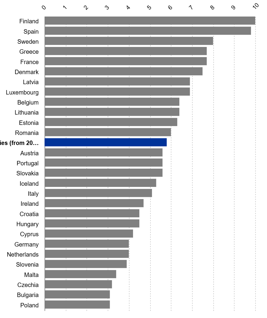 В Европейския съюз най-лошо е положението във Финландия (10.2%), Испания (9.8%), Швеция (8.7%), Гърция (7.7%) и Дания (7.5%).
