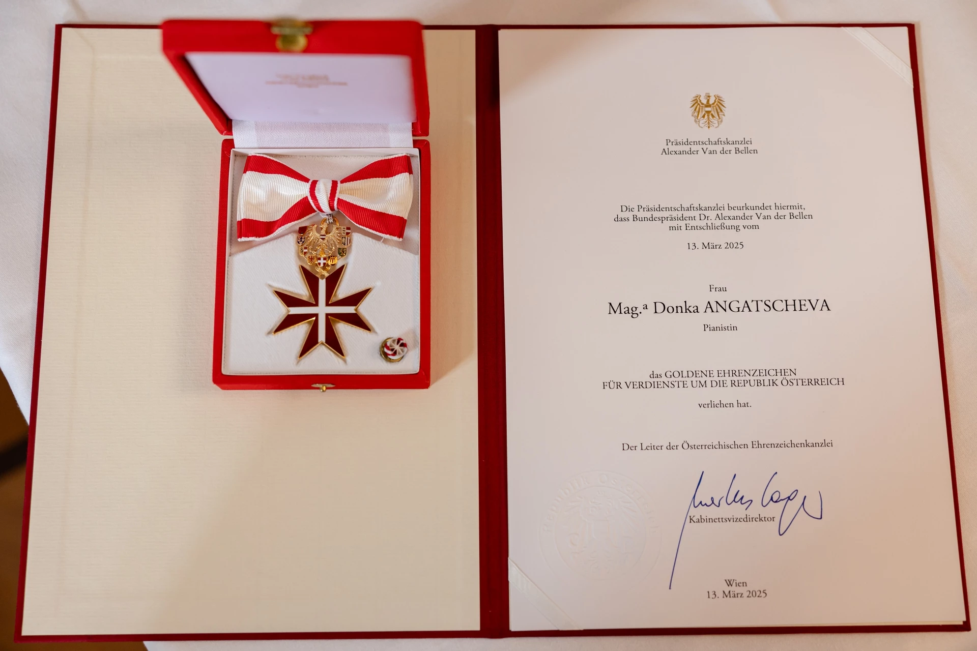 На 30 септември 2025 г., на тържествена церемония в Кунстлерхаус Виена (Salon Karlsplatz), изключителната пианистка Донка Ангъчева получи Златния почетен знак за заслуги към Република Австрия, връчен ѝ от името на президента на Австрия Александър Ван дер Белен. Това е едно от най-високите държавни отличия на Австрия. До този момент само шестима българи са били удостоявани с него. Донка Ангъчева е първият български артист, получил това изключително признание – факт, който подчертава нейната голяма роля в културния живот на Австрия и България.