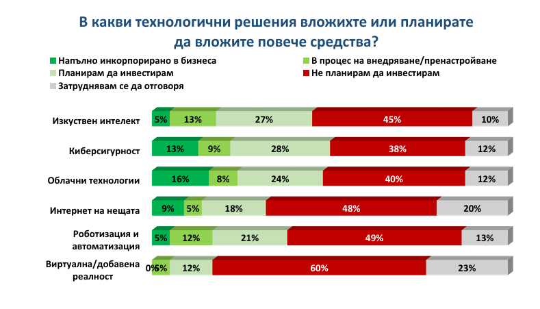 Въпреки глобалните тенденции, 46% от българските предприятия все още не планират да инвестират в дигитална трансформация. Иначе най-застъпени са облачните технологии (16% са внедрили такива) и киберсигурност (13% внедрили).