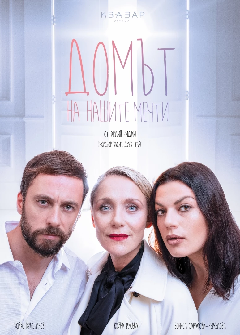 Премиера на най-новото заглавие на „Квазар Студио“ предстои на 15 декември в Театро отсам канала. Провокативната черна комедия „Домът на нашите мечти“ е шеметна сатира за имотния пазар, бездомността и неравенството. В ролите на младото семейство Оли и Джил, които мечтаят за собствено жилище, влизат Бойко Кръстанов и Бориса Сарафова-Черкелова, докато Койна Русева е мистериозната Мис Дий, която им предлага да сбъдне тяхното желание, но с една малка уловка.