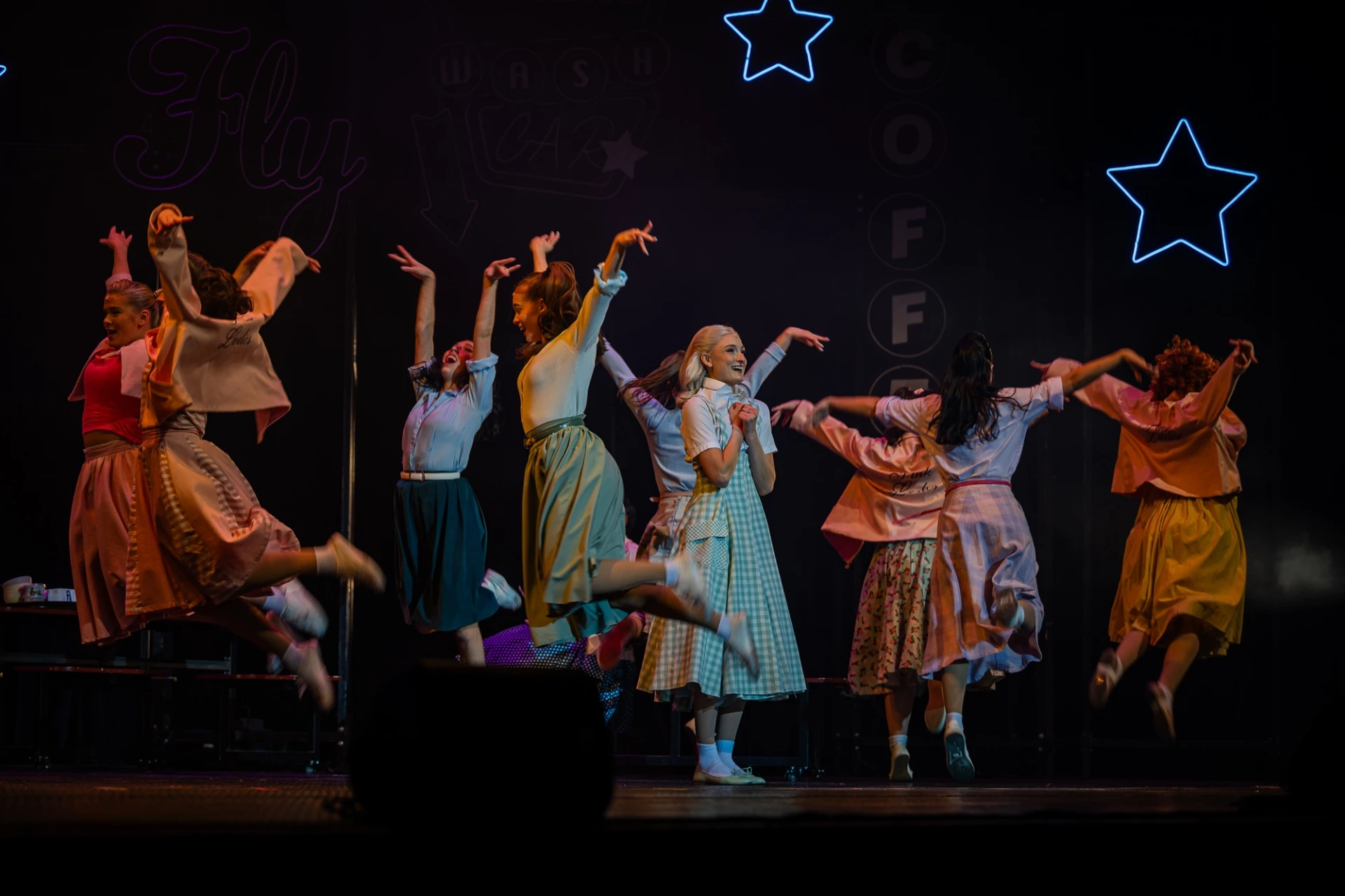 Сценичната версия предложи на публиката не само познатите хитове, но и сцени и песни, които не присъстват във филмовата адаптация. Декорите, изработени специално за спектакъла пък пренесоха аудиторията директно в Райдъл Хай – с внимание към детайла, стил и усещане за автентичност. Особено впечатляващ момент беше изпълнението на „Greased Lightnin’“ – на сцената влезе истинска кола, цяла, не като декор от отделни части. Това зрелищно решение предизвика възгласи и аплодисменти още при появата ѝ и затвърди усещането за мащабна международна продукция.