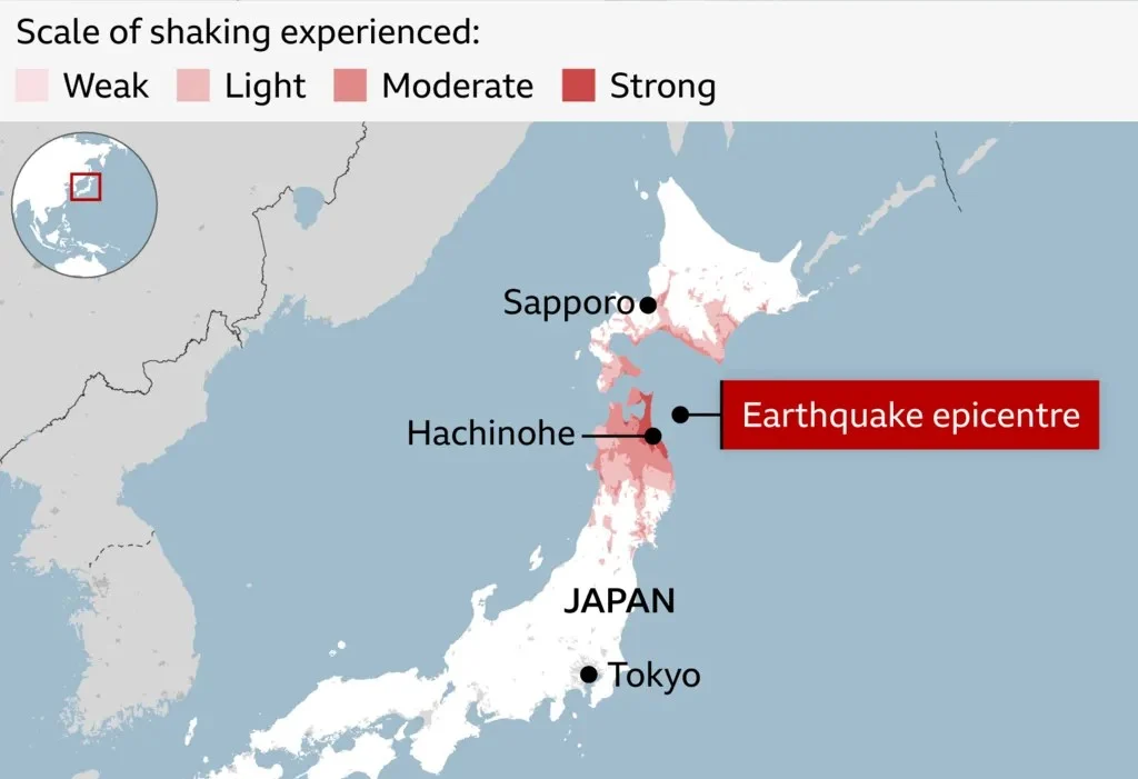 Трусът с епицентър на дълбочина 50 км, на около 80 км от брега на региона Аомори, предизвика предупреждения за цунами, които вече са отменени, като са наблюдавани вълни с височина 70 сантиметра.