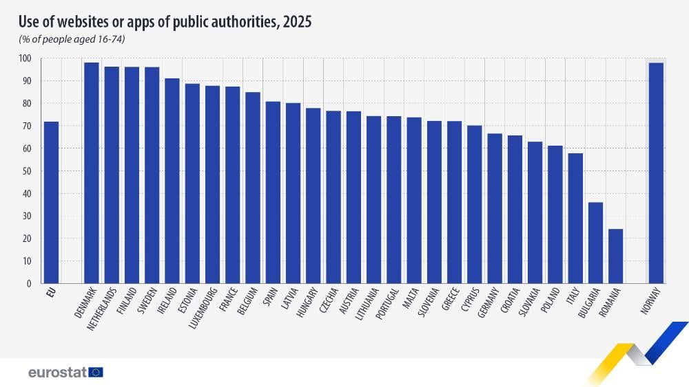 През 2025 г. средно 71.9% от гражданите на ЕС (на възраст 16-74 г.) са използвали уебсайтове или приложения на публични органи. Това е ръст от близо 2 процентни пункта спрямо предходната година и над 4 пункта спрямо 2022 г.