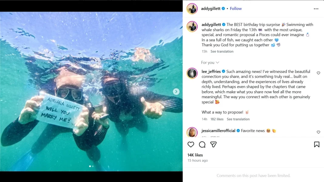Гилет сподели същата снимка в своя Instagram профил, като добави и повече подробности за предложението. „Най-добрата изненада за рожден ден“, написа тя. „Плуване с китови акули в петък, 13-и, с най-уникалното, специално и романтично предложение, което един Риби би могъл да си представи. В море, пълно с риби, ние се хванахме един друг. Благодаря ти, Боже, че ни събра.“