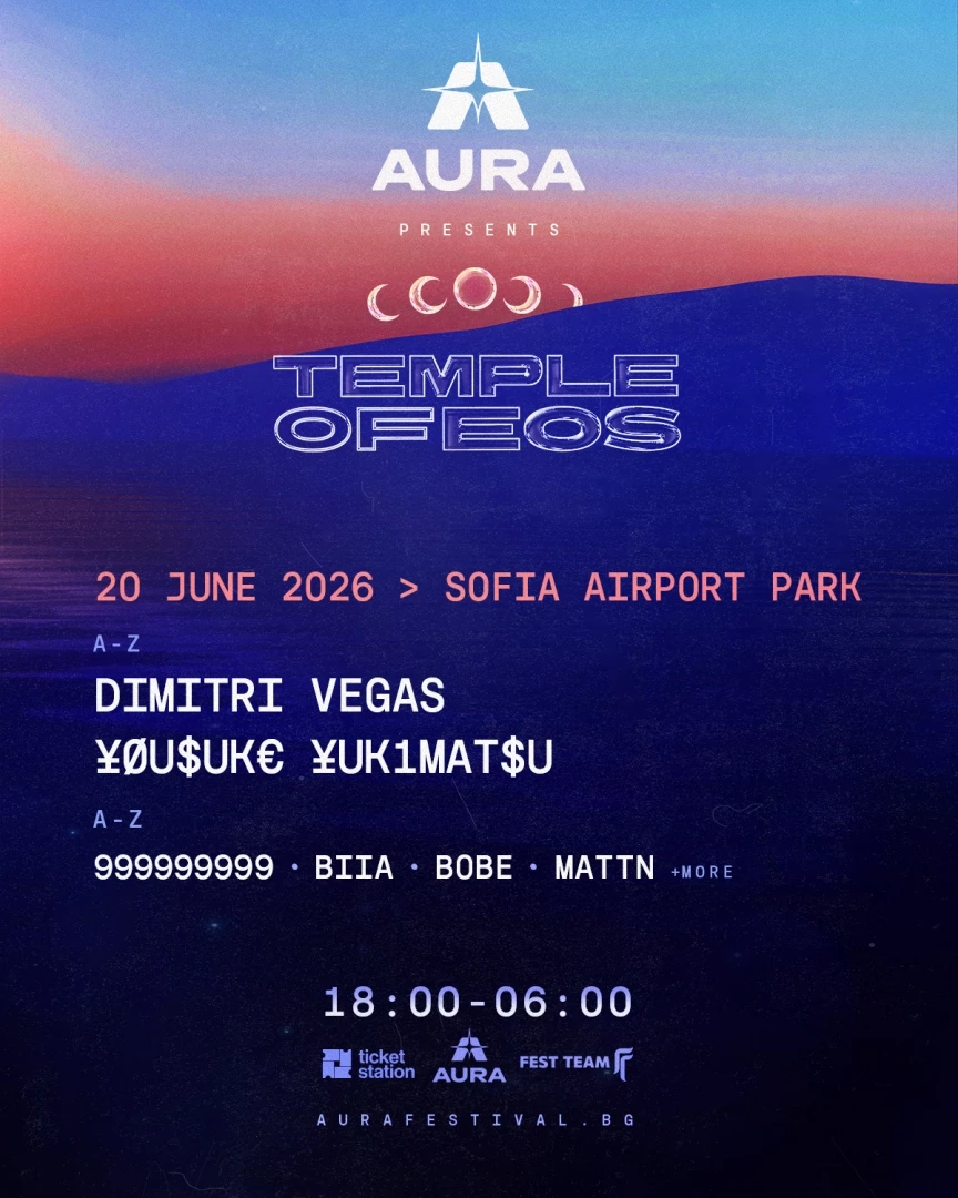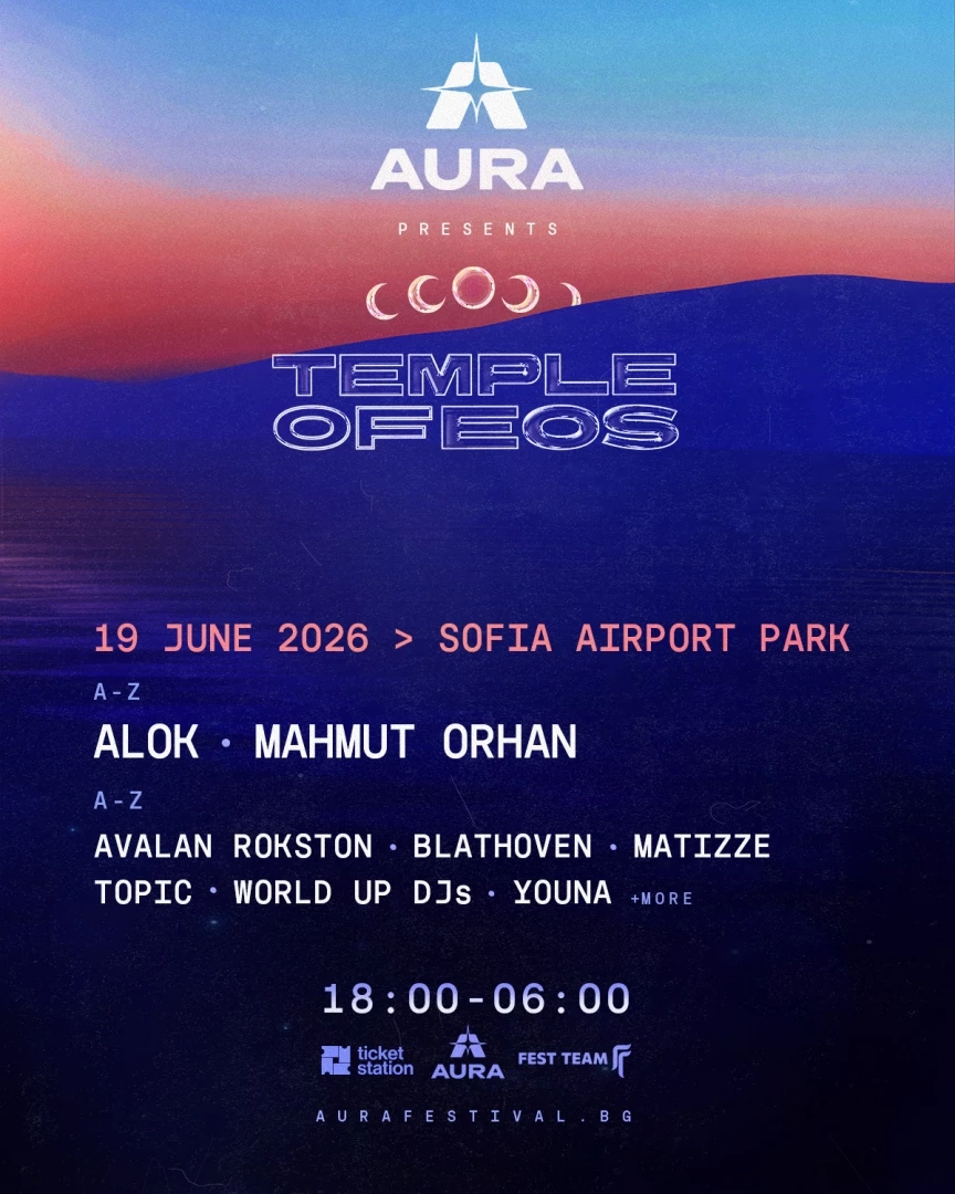 През юни 2026 София ще се превърне в пресечна точка между митология, звук и визуална магия. Второто издание на AURA FESTIVAL представя тематичния свят Temple of Eos – тридневно музикално приключение, в което всяка вечер е самостоятелен ритуал. От 19 до 21 юни новата локация на фестивала – Sofia Airport Park – ще бъде трансформирана в жив, дишащ свят, където музика, сценични конструкции, инсталации и артисти от световна класа се сливат в общо изживяване, което ще продължи до ранни зори. Еднодневни, тридневни, ВИП и младежки билети са вече в продажба в мрежата на Ticketstation.