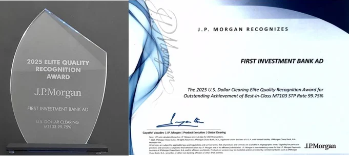 Fibank (Първа инвестиционна банка) за пореден път е отличена с престижната награда „Elite quality recognition award 2025“ от J.P.Morgan.