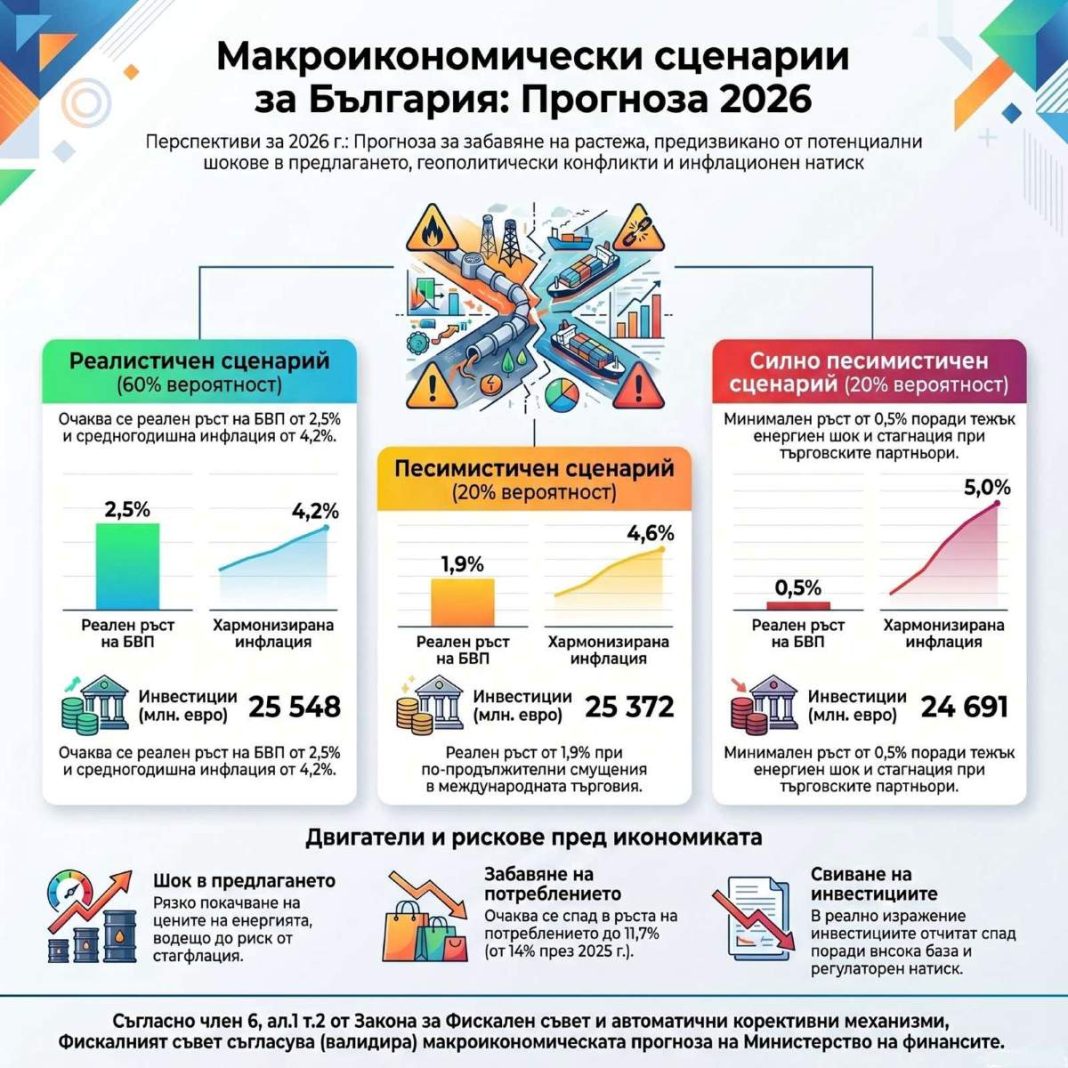 През 2026 г. България е изправена пред значителни рискове – както заради нестабилността на геополитическата обстановка, така и на вътрешнополитическата. Това се посочва в пролетната макроикономическа прогноза на Фискалния съвет, публикувана в четвъртък. Независимият консултативен орган е изготвил три сценария за развитието на българската икономика през тази година – реалистичен, песимистичен и силно песимистичен.