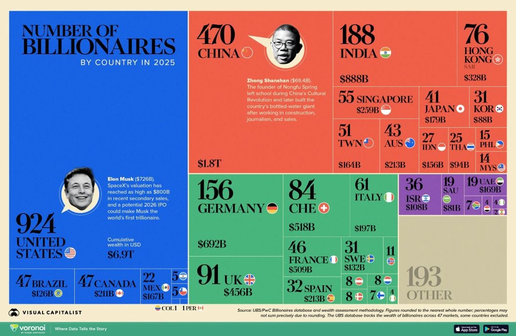 Инфографиката по-долу класира държавите по брой милиардери през 2025 г. на база данни от годишния доклад на UBS.