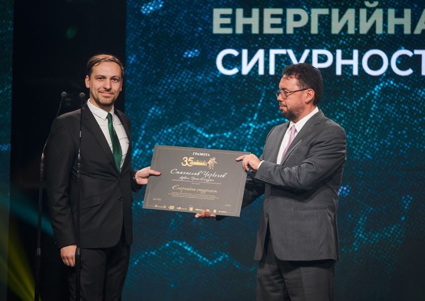Станислав Черкезов, управител на „Адванс Грийн Енерджи“, получи приза в категория „Енергийна сигурност“ за изграждането в Ловеч на най-голямата батерия за съхранение на енергия в целия Европейски съюз. Наградата връчи Димитър Белелиев, председател на Контролния съвет на КРИБ.