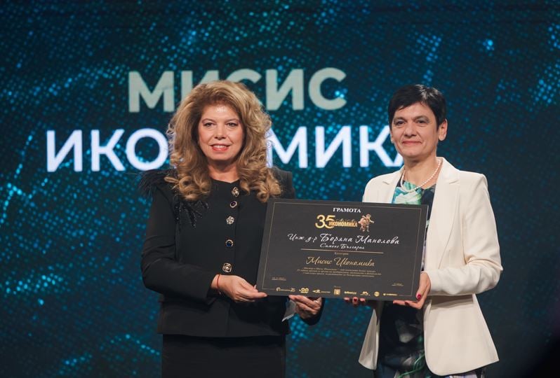 Две дами получиха наградата „Мисис Икономика“ – Петя Димитрова, главен изпълнителен директор на „Пощенска банка“ и д-р инж. Боряна Манолова, главен изпълнителен директор на „Сименс“ за България и Северна Македония.