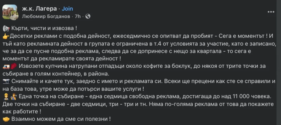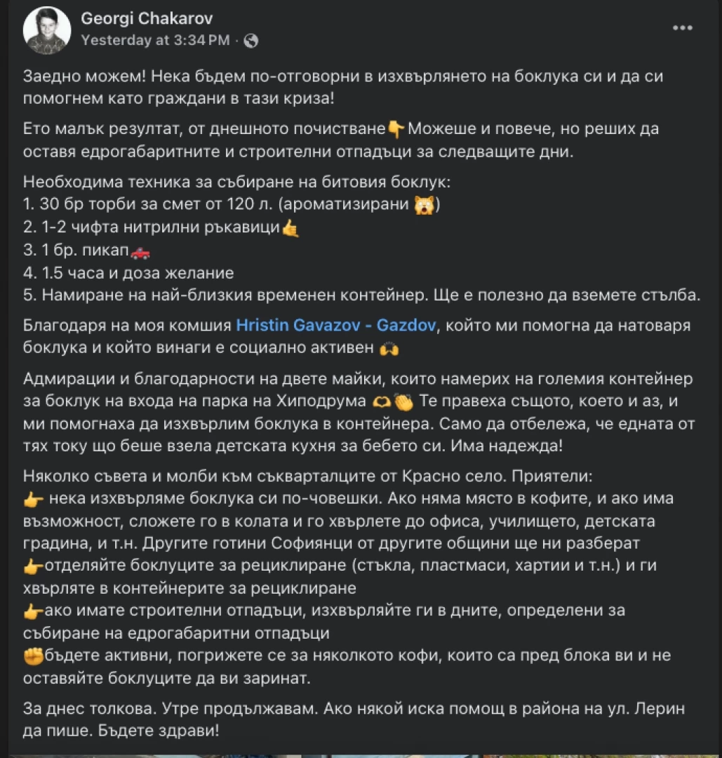 В отговор на ситуацията, жители на кварталите започнаха да се самоорганизират чрез квартални групи във Facebook. Те създават графици, за да почистват около кофите, извозват натрупани отпадъци с лични автомобили и дори публикуват снимки, за да мотивират други да се включат. В някои групи се координират общи акции по почистване през уикендите, а местни търговци предоставят ръкавици и чували. Още: Като войници без муниции с боклука: Районните кметове, такса смет и рисковете за други части на София