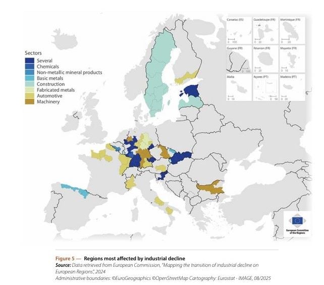 Докладът цитира като емблематичен пример автомобилното производство, което е отбелязало 46% спад в периода от януари 2019 г. до декември 2024 г. Този спад води до пряка загуба на работни места в основни за ЕС региони, които зависят от този сектор. Както показва и анализът на индустриалния риск, регионите, силно зависими от традиционни или енергоемки производства (включително български региони), са подложени на най-силен натиск за преструктуриране, което изисква мащабни инвестиции в обучение и нови икономически ниши.