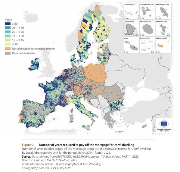 Картата, показваща „Брой години, необходими за изплащане на ипотека за жилище от 75 кв.м. , разкрива значително териториално разделение в достъпността на жилищата в ЕС. За България е видно, че столичните и големите градски центрове са зоните с най-голям натиск и най-дълъг период на изплащане – над 30 години.