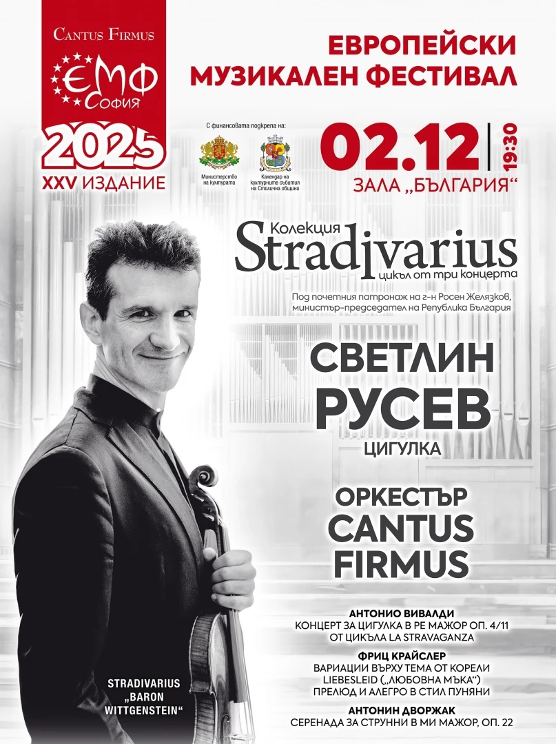 На 2 декември 2025 г. (19:30) в зала „България“ предстои едно от очакваните музикални събития на сезона: третият концерт от цикъла Колекция Stradivarius със забележителния цигулар Светлин Русев и Оркестър Cantus Firmus. Новата поредица на „Кантус Фирмус“ представя изявени български виртуози с техните редки, безценни инструменти, фокусирайки вниманието именно върху фигурата на солиста. Концепцията предвижда камерен струнен ансамбъл, в който цигуларят поема ролята на оркестров водач, концертмайстор и дори диригент. След впечатляващите концерти с Мила Георгиева (28 октомври) и Лия Петрова (17 ноември), финалът е поверен на Светлин Русев, който ще закрие първото издание на цикъла с атрактивна програма от творби на Антонио Вивалди, Фриц Крайслер и Антонин Дворжак. Това е и заключителното събитие за юбилейния 25-и Европейски музикален фестивал, реализиран с финансовата подкрепа на Министерството на културата и Столичната община – Календар на културните събития на Столична община за 2025 г.