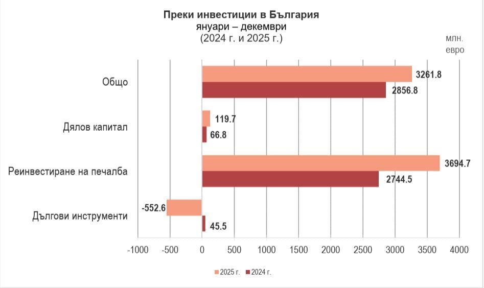 Основната част от стойността на ПЧИ през 2025 г. се дължи на реинвестираната печалба – т.е. вложенията на компаниите с мажоритарна чуждестранна собственост, направени за сметка на спечеленото от бизнеса им в страната. Общата сума по тази категория е 3.7 млрд. евро при 2.7 млрд. евро година по-рано.