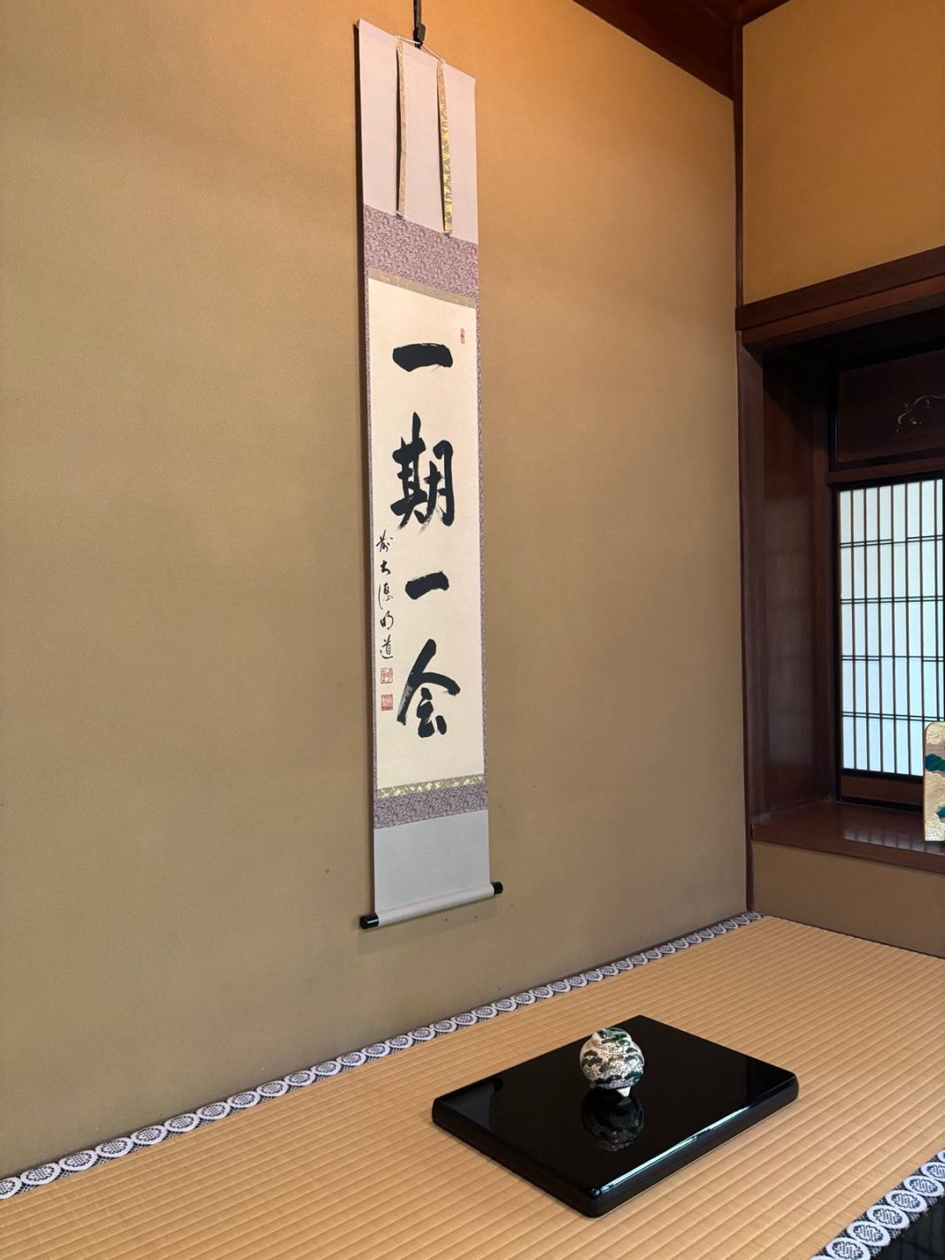Един от задължителните елементи е разпънатият свитък с калиграфия или картина според темата на срещата. На този свитък е изписано ичи-го-ичи-е, или това е японската идея, че всяка среща, всеки момент е уникален и никога няма да се повтори.