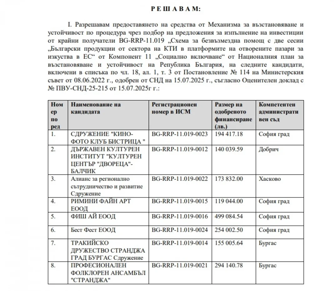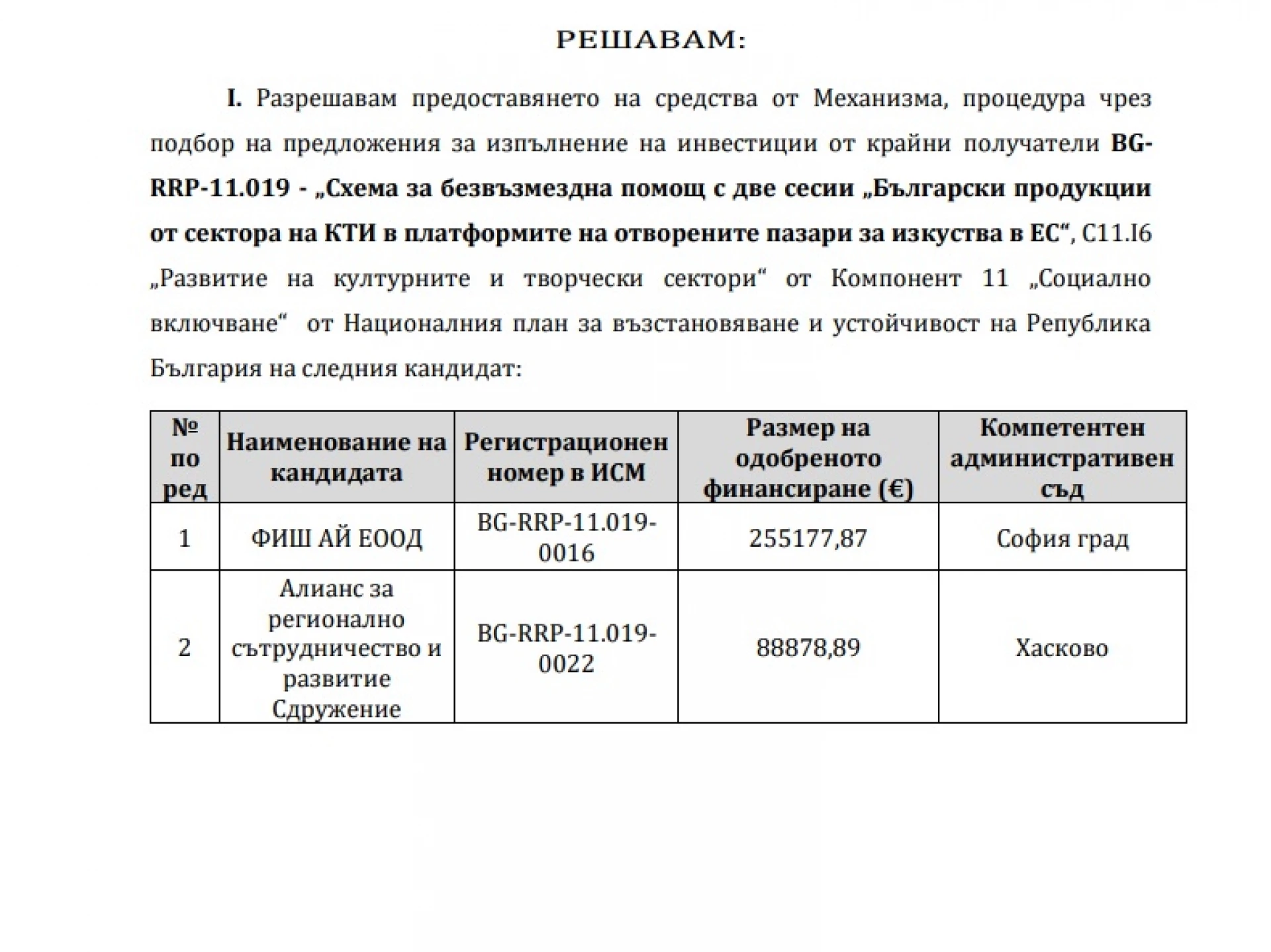 От справката става ясно, че на 19 декември 2025 г. фирмата получава 499 084, 54 лв. по процедура BGRRP-11.019. Липсват име и описание на проекта. По информация на „Площад Славейков“ Фиш Ай ЕООД печели финансиране още веднъж – този път 255 177,87 лв., за проекта „DESOLE“.
