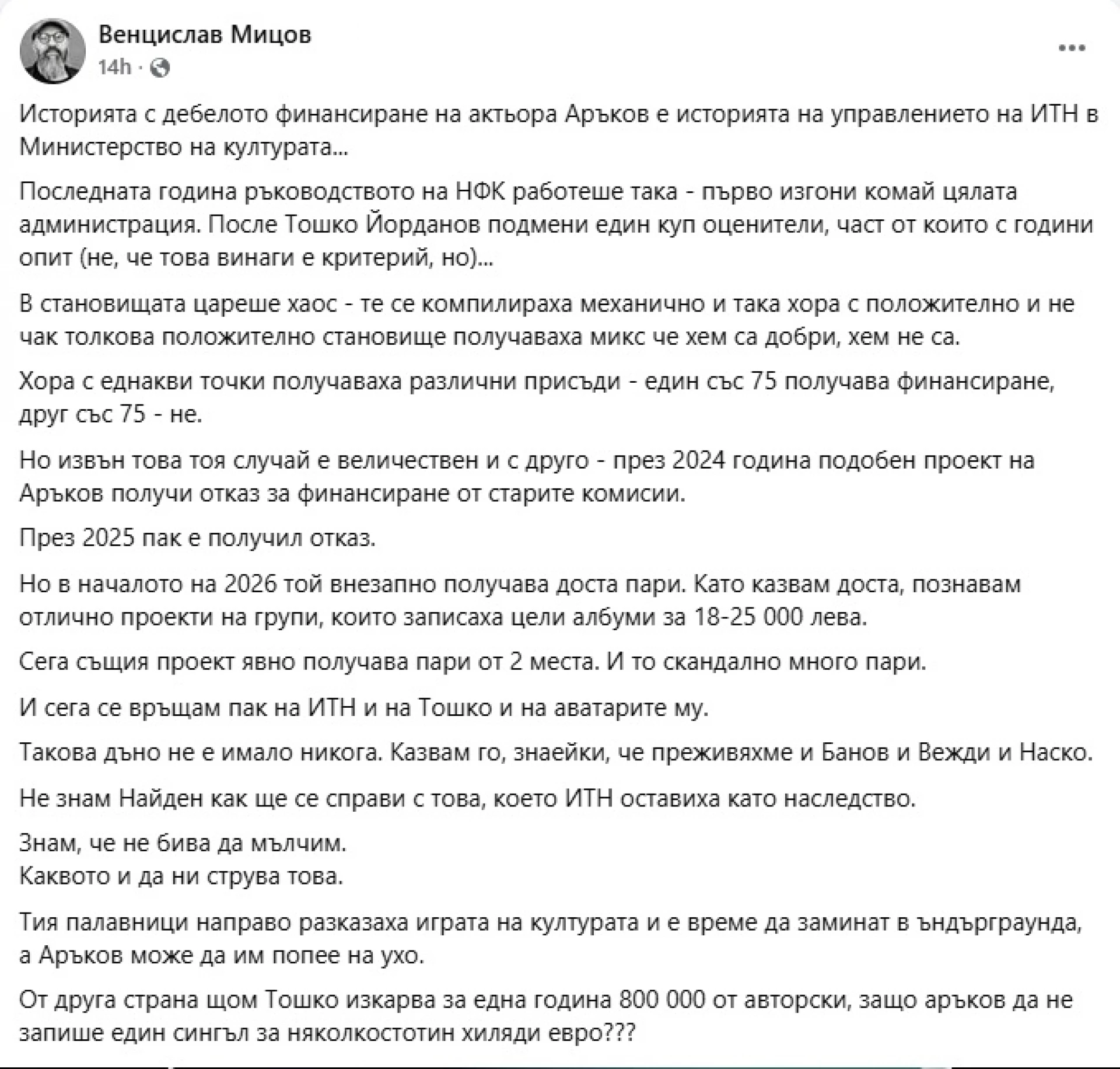 Актьорът Иво Аръков, популярен сред публиката от своите превъплъщения на малкия екран и на театралните сцени, е получил от държавата стотици хиляди евро, за да създава и популяризира своята авторска музика. Финансирането е от Национален фонд „Култура“ (НФК) и е одобрено на два етапа – в края на 2025 г. и в началото на 2026 г., което съвпада с последните месеци от работата на кабинета Желязков. Принципал на НФК е министърът на културата, който по това време е Мариан Бачев.