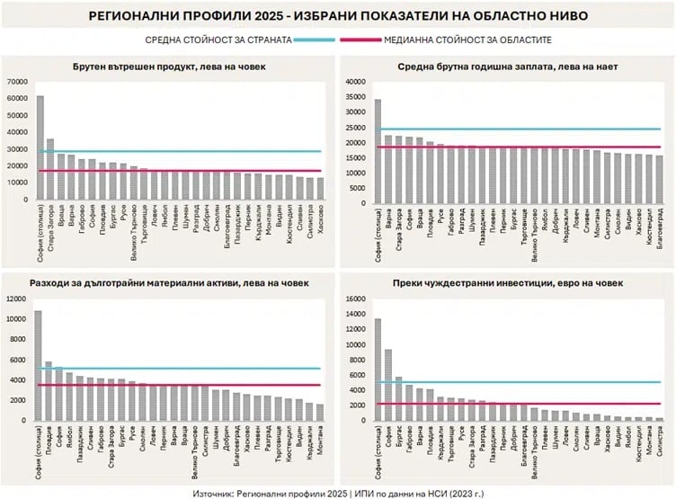 В тазгодишното издание изследването на ИПИ „Регионални профили: показатели за развитие“ 2025 столицата отново се откроява като безспорен лидер в повечето категории на икономическото развитие на областите. Съсредоточаването на инвестиции (вътрешни и външни), високи заплати и нови компании води до това, че при някои индикатори София е единствената област с над средната за страната стойност. По този начин често традиционно силните области, обикновено също със силни сектори на услугите и индустрията, не могат изпъкнат в общата статистика.