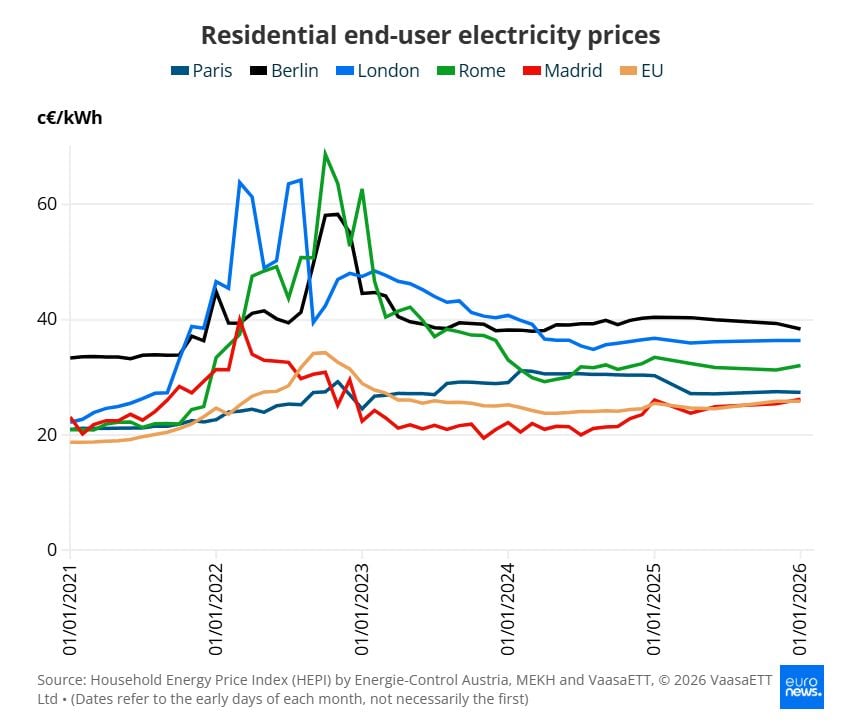 Между ноември 2021 г. и януари 2026 г. цените на природния газ в столиците на ЕС са се увеличили с 24%. Варшава отчита най-голям ръст (88%), следвана от Братислава (85%), Лисабон (77%) и Прага (70%).