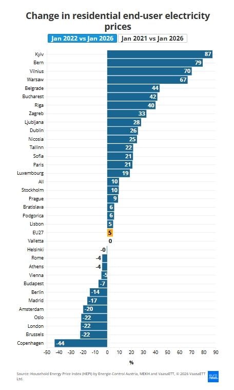 Според HEPI, крайните цени на електроенергията за битови потребители в столиците на ЕС са се повишили с 5% между януари 2022 г. и януари 2026 г. Ръстът обаче е започнал още преди инвазията: между януари 2021 г. и януари 2026 г. увеличението достига 38%.