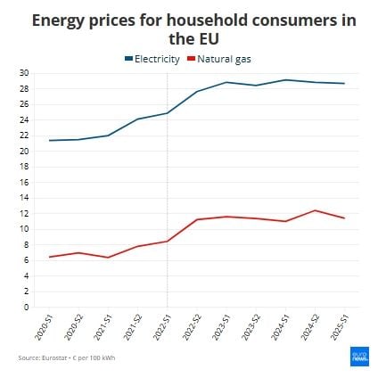 Между съпоставимите периоди на 2021 и 2025 г. цените на електроенергията за домакинствата в ЕС са нараснали с 30% – от 22 евроцента за киловатчас до 28.7 евроцента за киловатчас. За същия период природният газ е поскъпнал със 79% – от 6.4 евроцента за киловатчас до 11.4 евроцента за киловатчас.