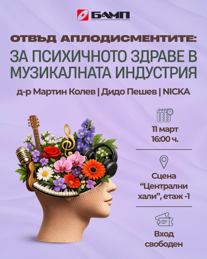 На 11 март 2026 г., от 16:00 ч. в Сцена „Централни хали“, етаж -1 (бул. „Княгиня Мария Луиза“ 25), Българската асоциация на музикалните продуценти (БАМП) ще даде началото на един от най-важните разговори в музикалната индустрия днес – този за психичното здраве и устойчивостта на хората, които движат всеки албум, кампания или турне – без стигма и сензации. Събитието е с вход свободен, след задължителна предварителна регистрация, тъй като местата са ограничени: https://tally.so/r/rj69Lv.
