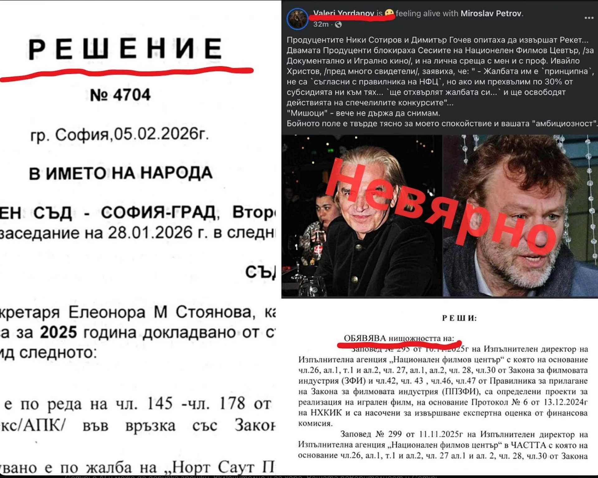 По думите на Гочев обаче, вместо НФЦ да изпълни указанията, издава нови заповеди на базата на стария протокол от оценките на художествената комисия. „Февруари 2026 г.: Съдът обявява тези нови заповеди за НИЩОЖНИ заради грубо неспазване на указанията на съда, които са задължителни за НФЦ (чл. 177, ал. 2 от АПК).“, добавя Гочев в своята Facebook публикация.