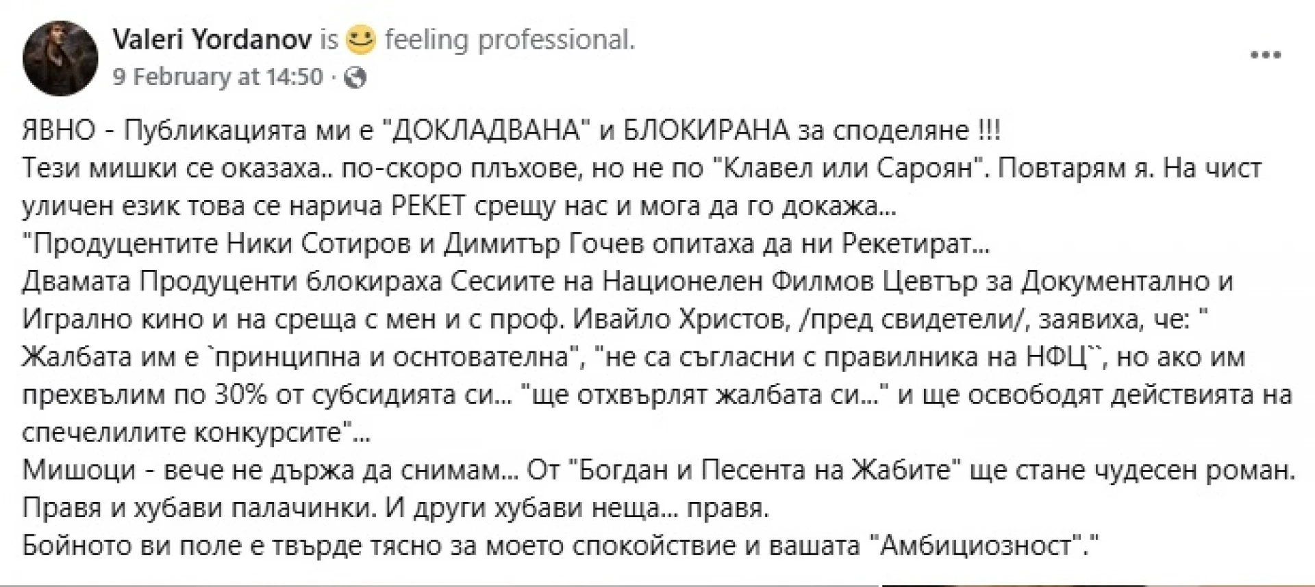 Обвинения в клевета, незаконосъобразни действия и ощетяване се разменят в последните дни в социалните мрежи между Валери Йораднов (актьор, режисьор и писател) и режисьора Димитър Гочев. Причина за напрежението е блокирана сесия за финансиране на български филми от Национален филмов център (НФЦ), което прави невъзможно освобождаването на парите и започването на същинската работа по създаването на филмовите произведения.