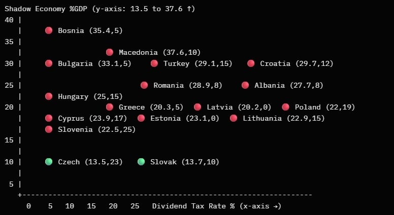 На първо място, Домусчиев посочва, че няма статистически значима корелация между данък „Дивидент“ и нивата на сива икономика в държавите от Източна Европа, които споделят сходни проблеми в борбата срещу нея и причините за пораждането ѝ. Сравненията с Франция или Германия, които Стойнев прави, за този феномен са нерелевантни