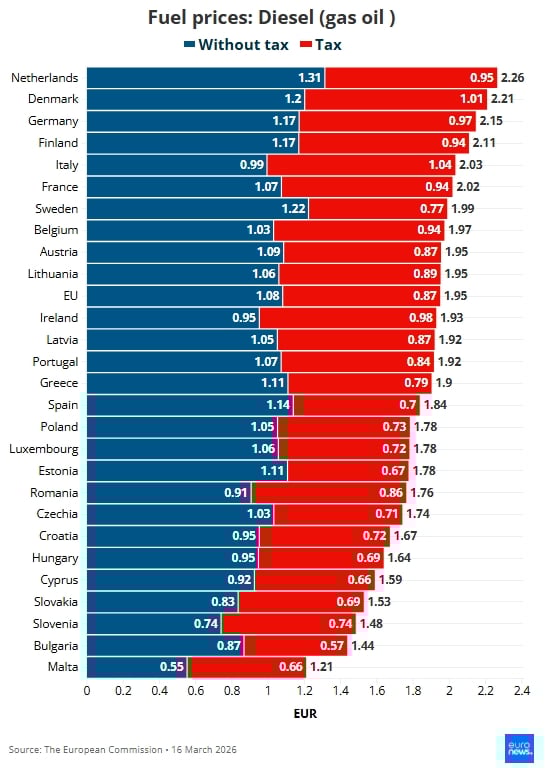 Данъците на литър варират от 0.58 евро в България до 1.24 евро в Нидерландия. Според данни на Евростат към 16 март, средното за ЕС е 0.96 евро, като стойностите надхвърлят 1 евро в Дания, Германия, Финландия, Гърция, Ирландия и Франция.