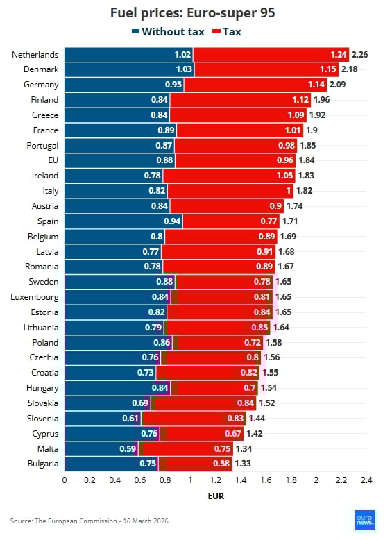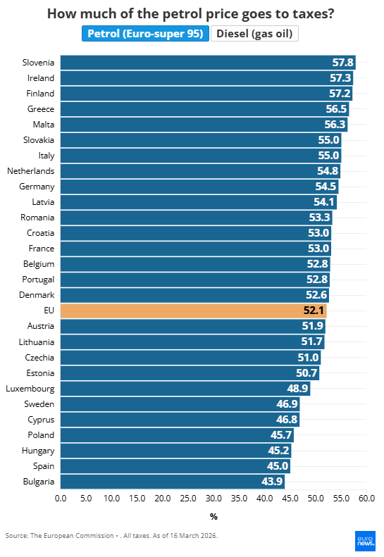 Първият и най-важен показател е делът на общите данъци – включително акциз и ДДС – в цената на горивото. Те съставляват повече от половината от цената на бензина (А 95) в ЕС, според изчисления на Euronews Business, базирани на данни от Европейската комисия към 16 март 2026 г.