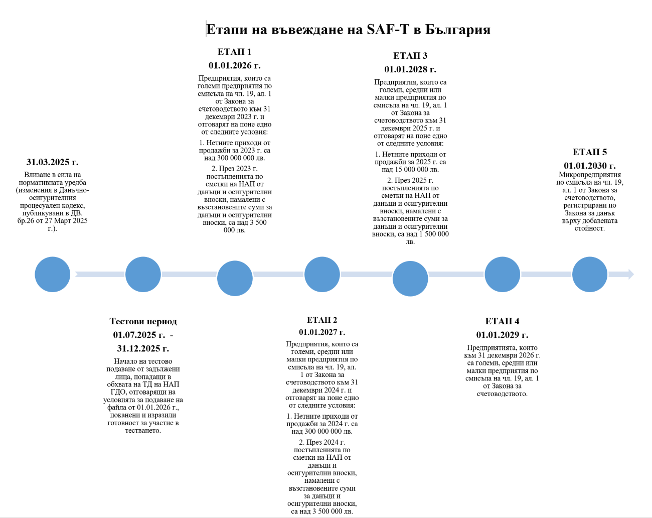 След големите данъкоплатци, от 1 януари 2027 г. големите, малките и средните предприятия по смисъла на Закона за счетоводството ще имат задължението да изпращат такъв файл на НАП. От 2030 г. пък това ще важи за всички фирми, регистрирани по ДДС, включително за микропредприятията (виж времевата линия отдолу).