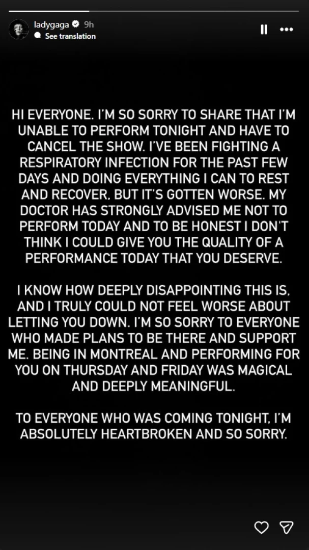 Лейди Гага отмени концерта си в Монреал поради влошено здраве. Няколко часа преди да излезе на сцената в канадския град в рамките на турнето си Mayhem Ball, тя обяви, че се налага да отмени концерта си, след като се е разболяла от респираторна инфекция. „Много съжалявам, че трябва да ви съобщя, че не мога да изляза на сцената тази вечер и се налага да отменя концерта“, сподели Гага в Instagram Story на 6 април. „През последните няколко дни се боря с респираторна инфекция и правя всичко възможно, за да си почивам и да се възстановя, но състоянието ми се влоши. Лекарят ми категорично ми препоръча да не излизам на сцената днес и, честно казано, не мисля, че днес бих могла да ви предложа изпълнението, което заслужавате. Много съжалявам пред всички, които бяха планирали да дойдат и да ме подкрепят“, допълни певицата.