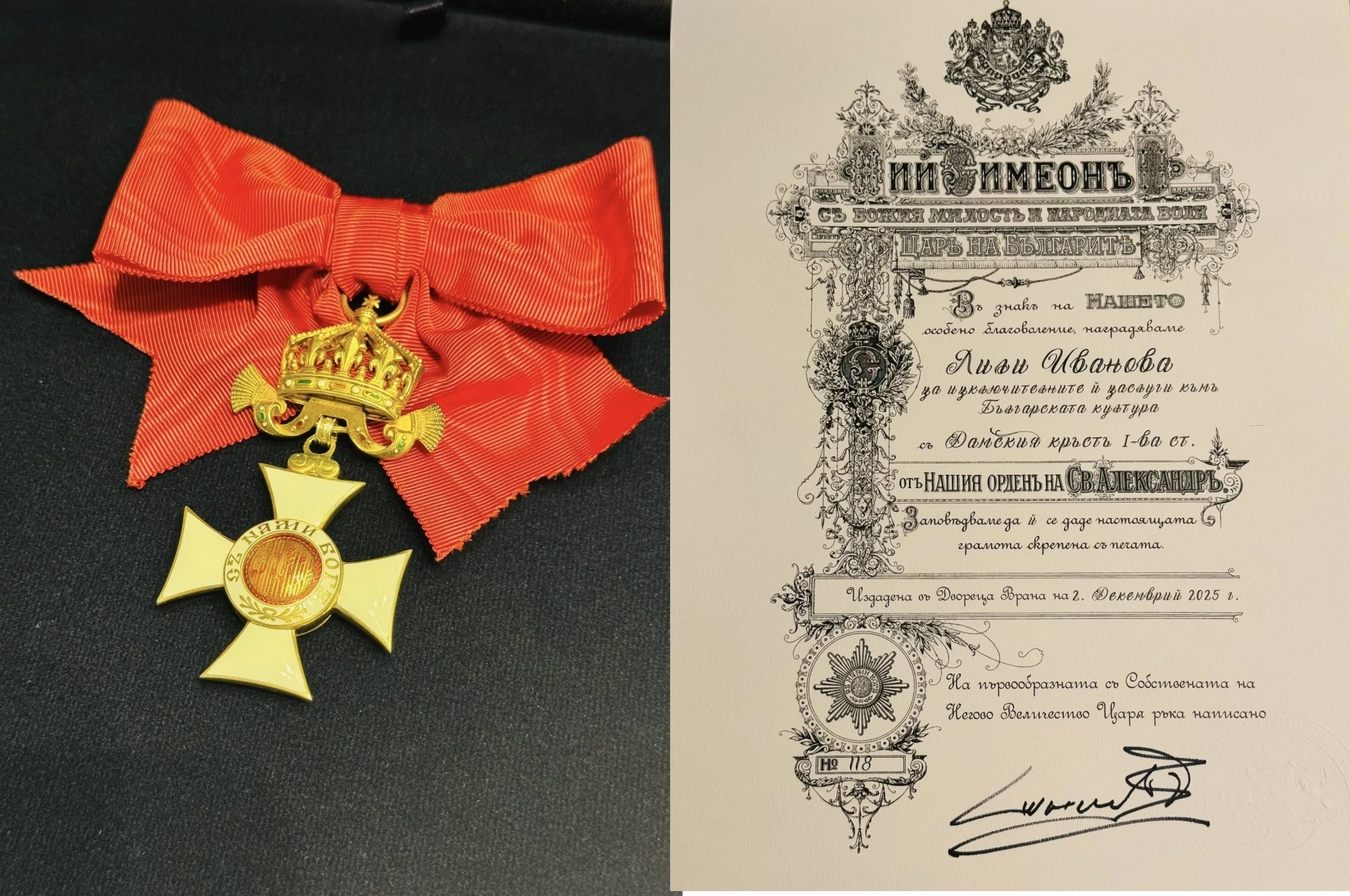 Лили Иванова беше удостоена със специално отличие заради приноса ѝ към българската култура. Певицата получи „Дамски кръст“, първа степен, на ордена „Свети Александър“. Той ѝ беше връчен лично от Симеон Сакскобургготски в двореца „Врана“. Примата на българската музика сама се похвали, като качи снимки във Facebook и изказа благодарността си.