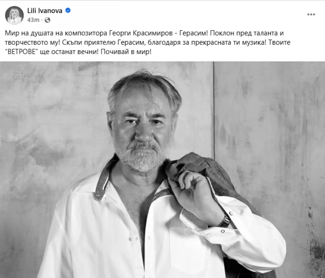 „Мир на душата на композитора Георги Красимиров – Герасим! Поклон пред таланта и творчеството му! Скъпи приятелю Герасим, благодаря за прекрасната ти музика! Твоите „ВЕТРОВЕ“ ще останат вечни! Почивай в мир!“, това написа Лили Иванова в своя Facebook профил по повод кончината на Красимиров.
