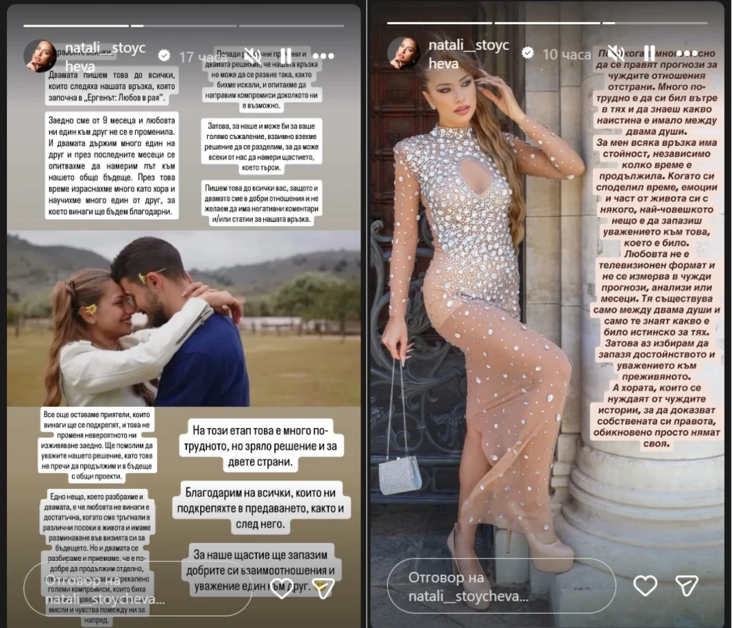 „Понякога в живота идва момент, в който разбираш, че пътищата на двама души просто тръгват в различни посоки. За мен е важно да запазя уважението към човек, който в даден момент е бил мой избор и част от живота ми. Когато си споделял време, емоции и моменти с някого, вярвам, че е честно към себе си и към него да запазиш това уважение, независимо как се развиват нещата след това. Да, имали сме хубави моменти и сме се обичали по свой начин. Именно затова смятам, че най-зрялото решение е да продължим напред с благодарност за преживяното, а не с негативни чувства“, написа Натали.