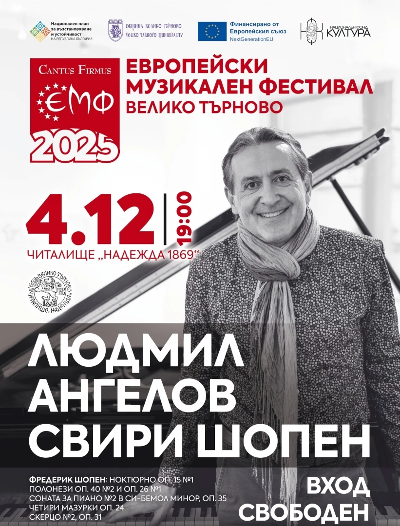 „Кантус Фирмус“ представя голям клавирен рецитал на забележителния български пианист Людмил Ангелов във Велико Търново, като част от програмата на престижния форум за класическа музика „Европейски музикален фестивал“ 2025. На 4 декември 2025 г. харизматичният музикант ще излезе на сцената на читалище „Надежда 1869“ (19:00 ч.), за да прикове вниманието на аудиторията със своето пианистично майсторство и възвишена емоция.