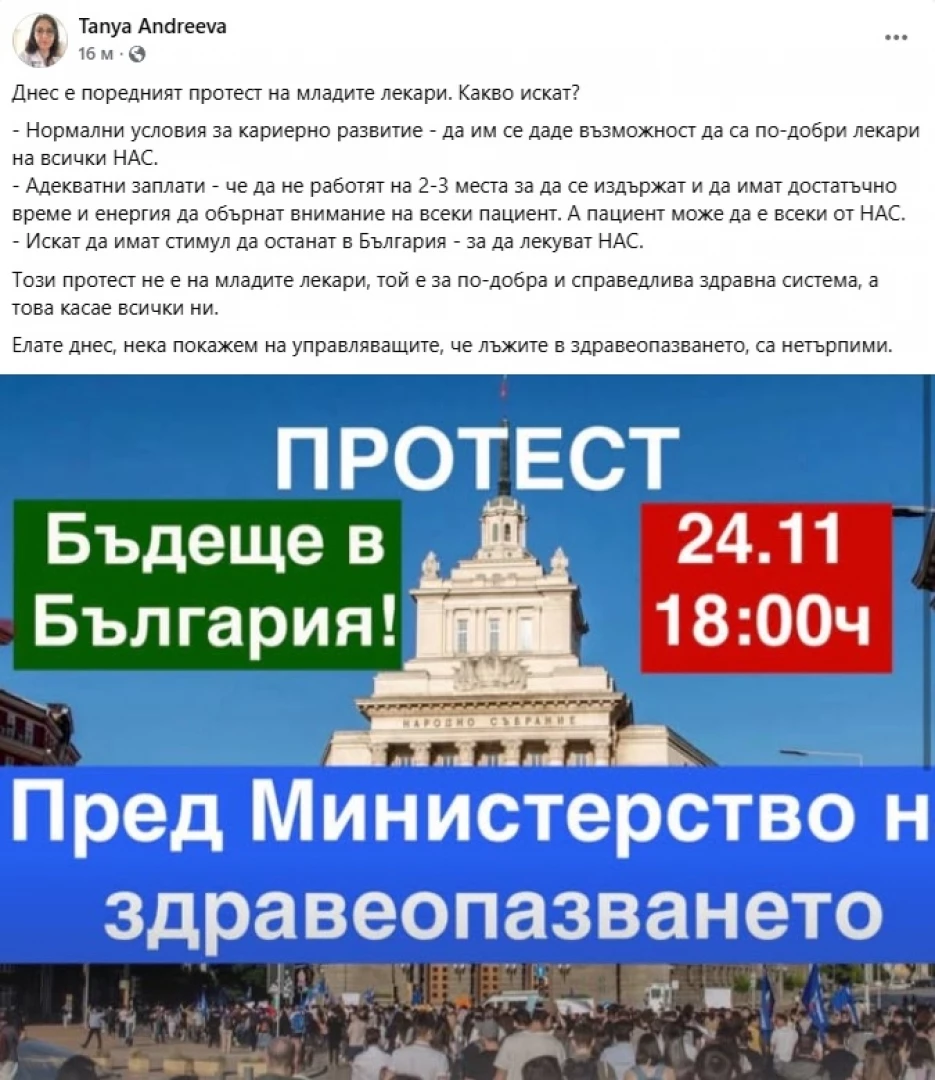 Призив за подкрепа на нейните колеги отправи д-р Таня Андреева, бивш народен представител от „Да, България“, педиатър и ревматолог и един от основните обществени активисти, работещи за каузата за прозрачно и ефективно изграждане на Национална детска болница.