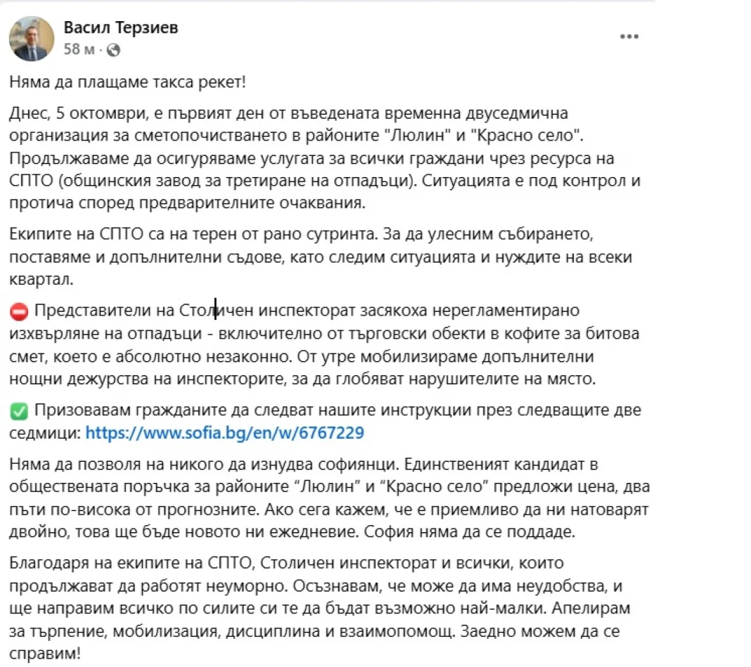 „Няма да позволя на никого да изнудва софиянци. Единственият кандидат в обществената поръчка за районите “Люлин” и “Красно село” предложи цена, два пъти по-висока от прогнозните. Ако сега кажем, че е приемливо да ни натоварят двойно, това ще бъде новото ни ежедневие. София няма да се поддаде. Няма да плащаме такса рекет“, написа още Терзиев.